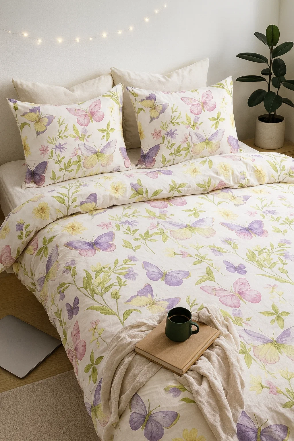 Wprowadź do swojej sypialni świeżość i lekkość wiosennego ogrodu dzięki naszemu kompletowi pościeli ozdobionemu subtelnym motywem motyli i kwiatów. Pościel 160×200 cm wykonano z wysokiej jakości mikrofibry, która jest wyjątkowo miękka, lekka i przyjemna w dotyku, zapewniając komfortowy odpoczynek każdej nocy.