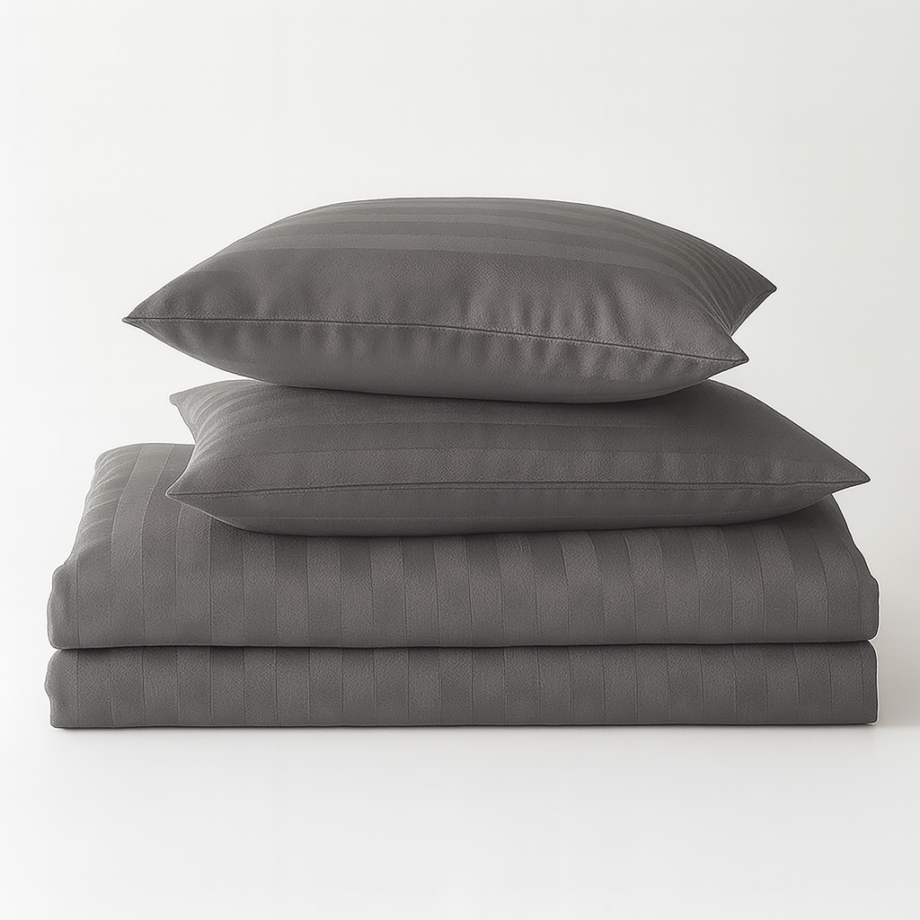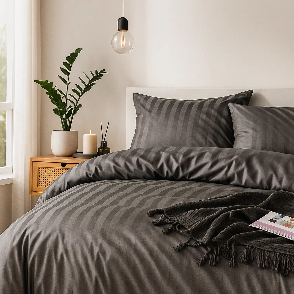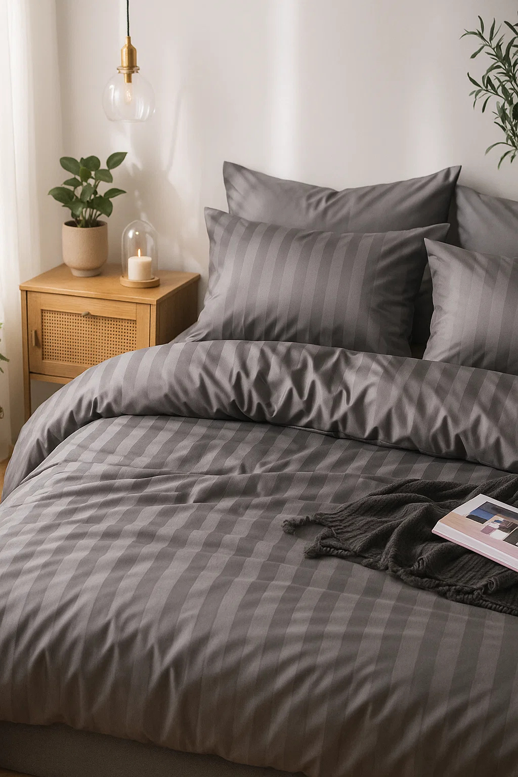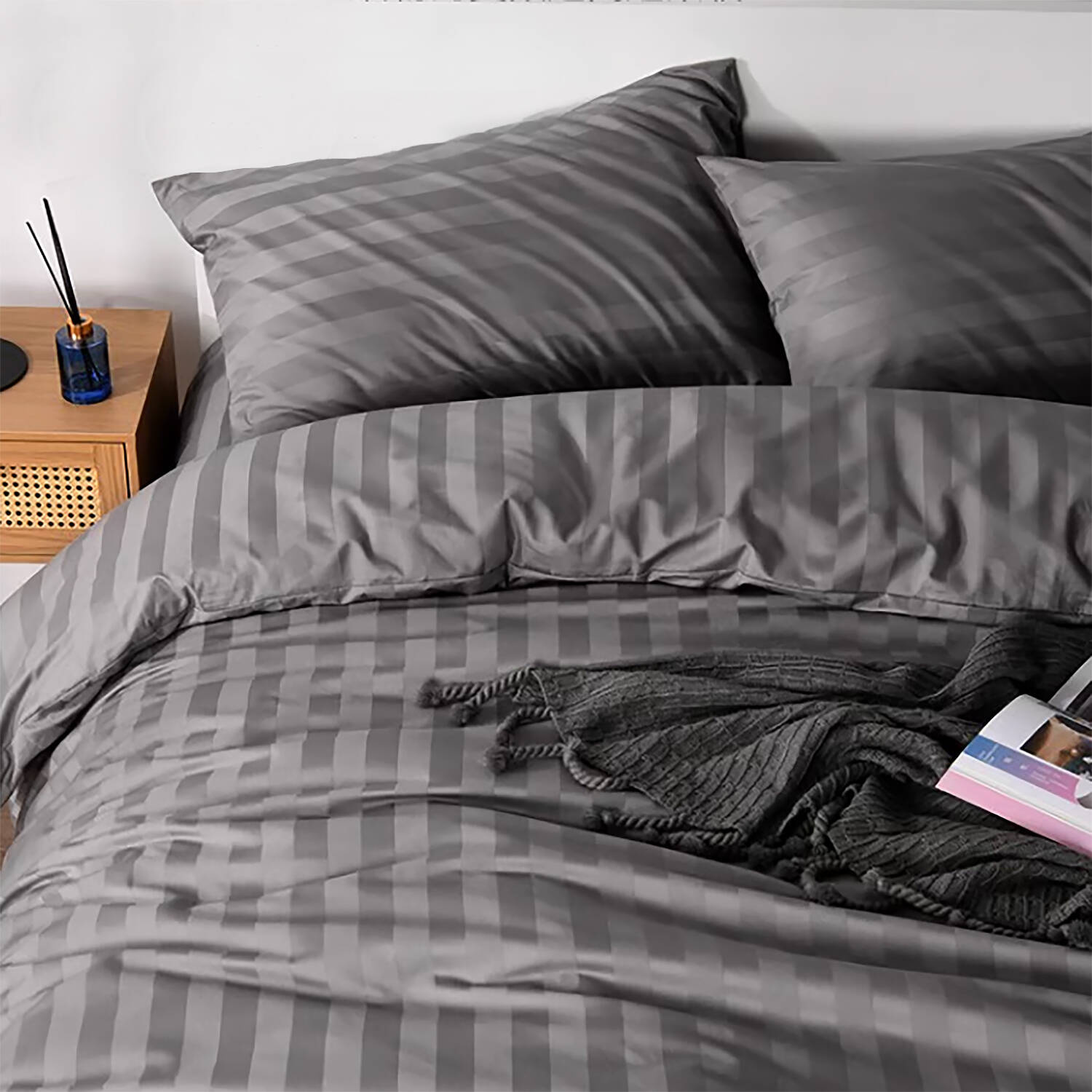 - Komplet pościeli satynowej w ozdobne pasy 160x200 skład: 100% bawełna syntetyczna dwustronna poszewka na kołdrę i 2 x poszewka na poduszkę 70x80, gładka pościel w kolorze ciemny szary, pościel w paski adamaszek