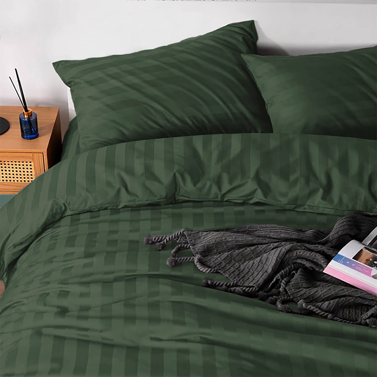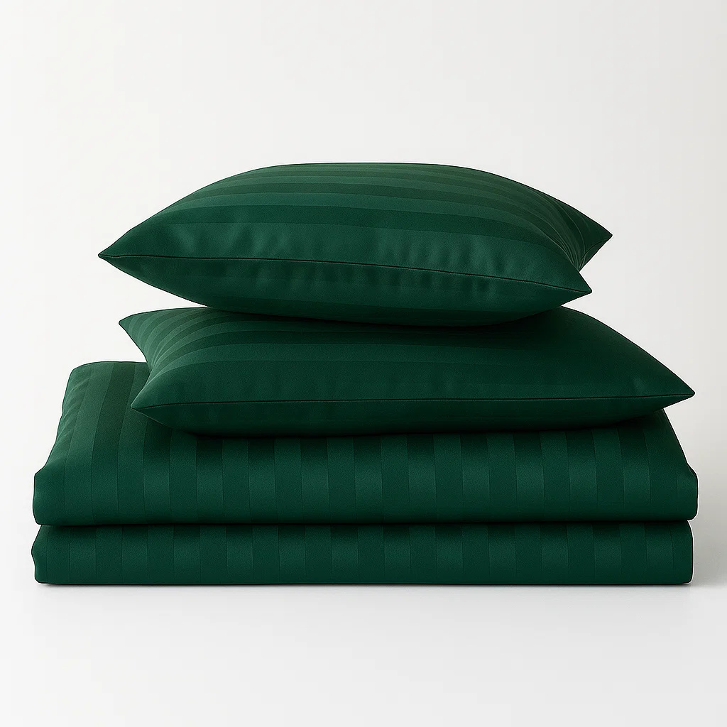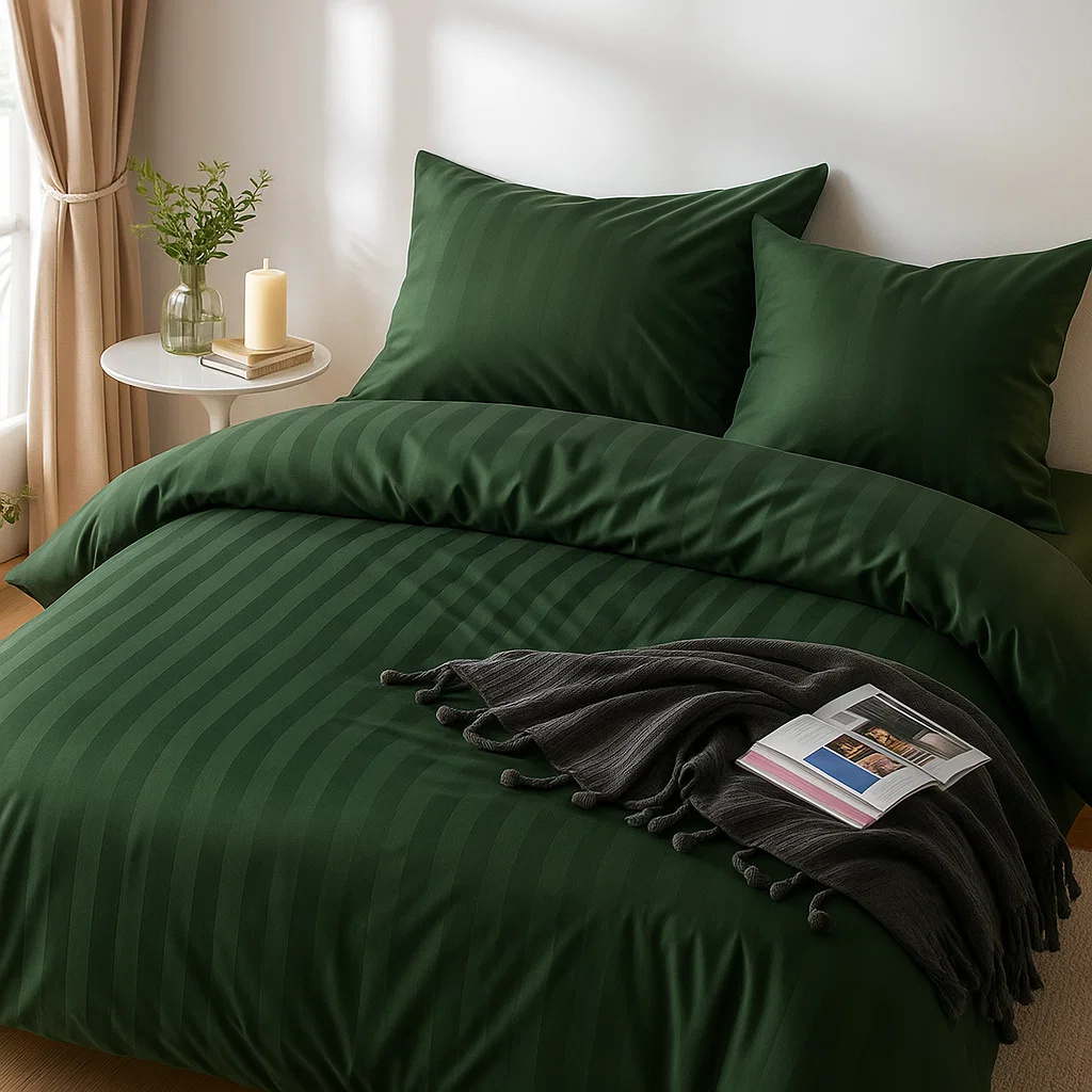 - Komplet butelkowej zielonej pościeli satynowej w zdobienia żakardowe 160x200 skład: 100% bawełna syntetyczna dwustronna poszewka na kołdrę i 2 x poszewka na poduszkę 70x80, gładka pościel w kolorze ciemna zielona, w paski, adamaszek