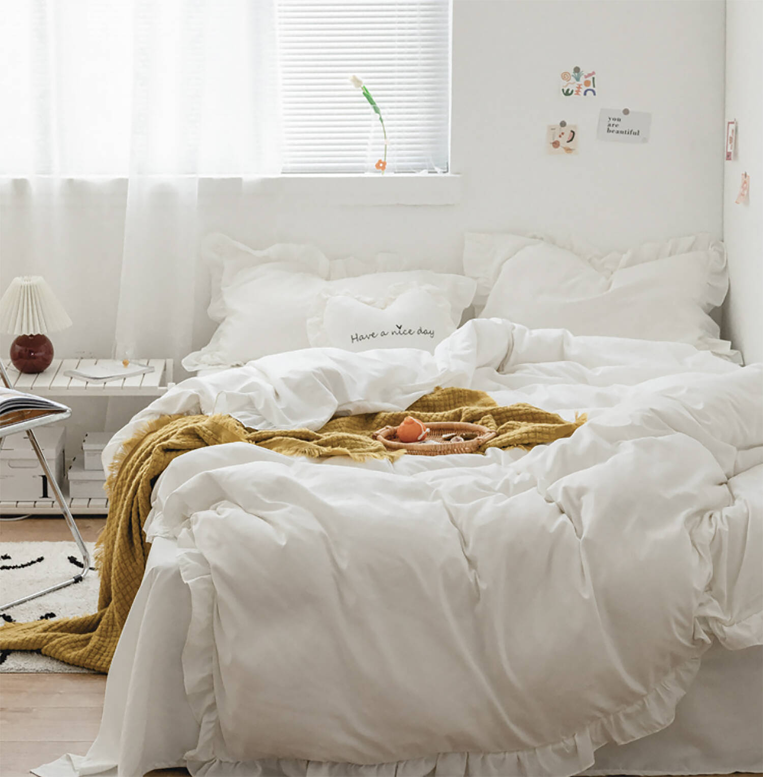 Komplet pościelowy z ozdobną falbanką na brzegach wykonany z wysokiej jakości mikrowłókna. Jest to materiał, który bardzo szybko schnie oraz nie wymaga prasowania, dzięki czemu pranie i zmiana pościeli staje się przyjemnością. Posiada jednolity kolor który nie traci intensywności, nawet po wielokrotnym praniu.