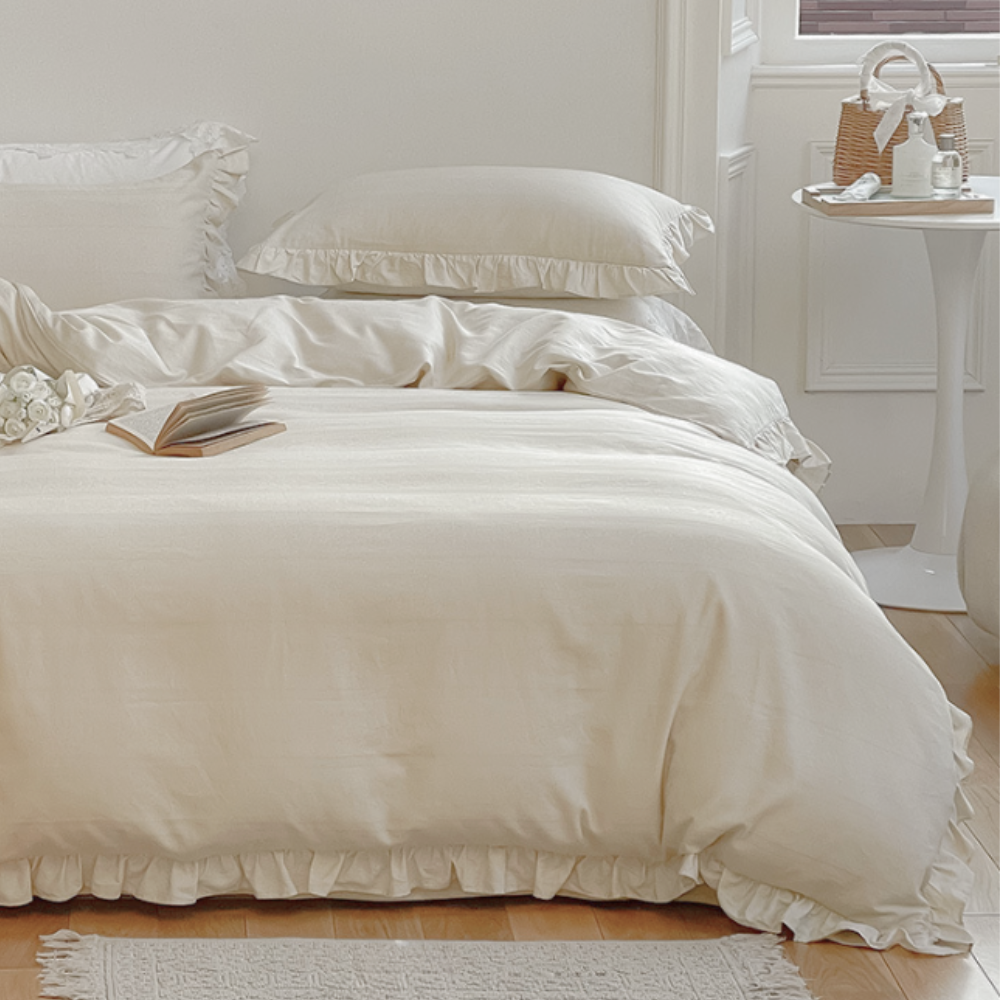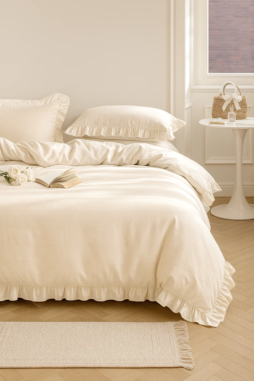 - Podkreśl elegancję swojej sypialni pościelą z urokliwą falbaną w delikatnym odcieniu ecru. Luksusowy komfort i wyjątkowy styl zapewnią Ci niezapomniane noce. Zanurz się w miękkości i klasyce :)