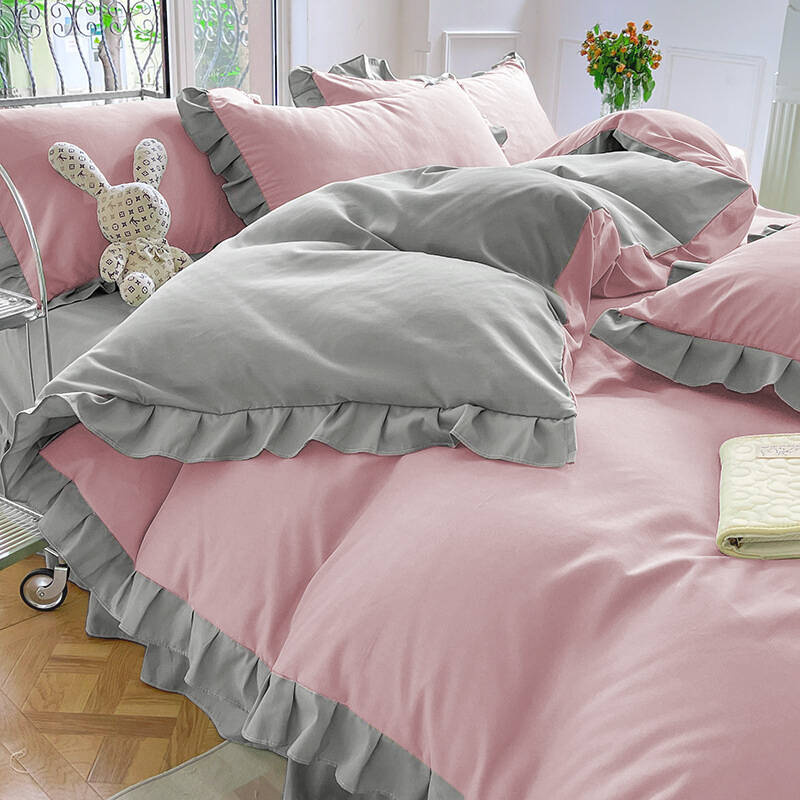 • Komplet pościeli z falbaną 200x220, dwustronna poszewka na kołdrę i 2 x poszewka na poduszkę 70x80, pościel różowa, jasna szara, z ozdobnym obszyciem