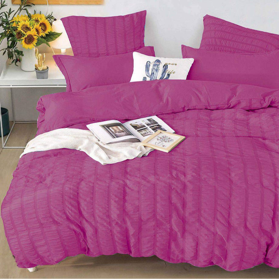 - Komplet pościeli z mikrowłókna 200x220 skład: 100% mikrowłókno dwustronna poszewka na kołdrę i 2 x poszewka na poduszkę 70x80, pościel ciemna różowa marszczona z kory