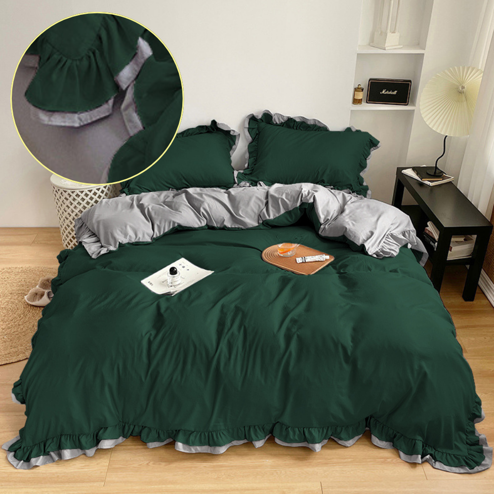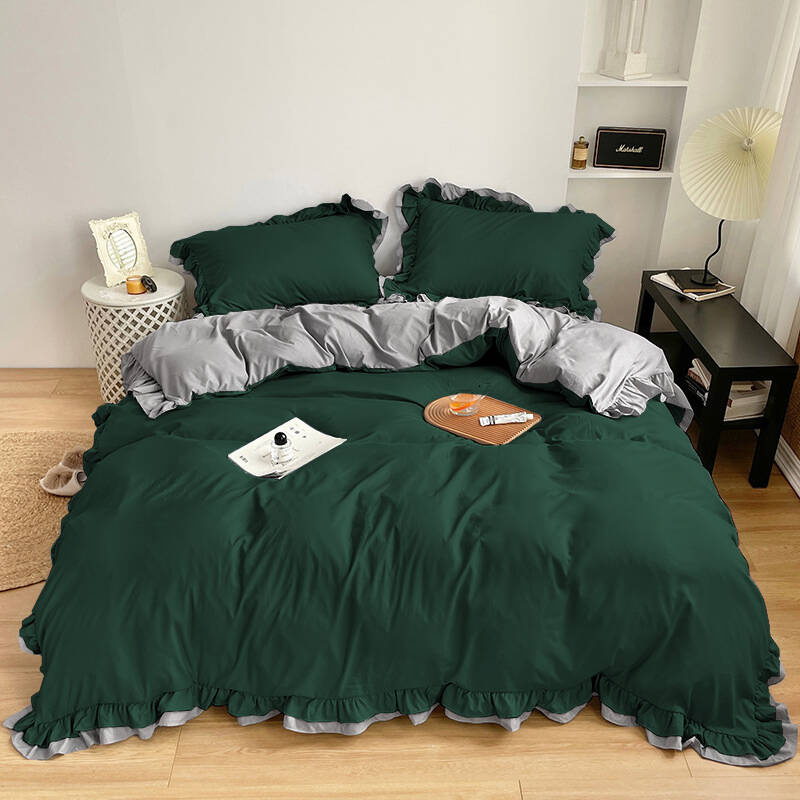 Pościel z podwójną falbanką dwukolorowa butelkowa zielona-jasnoszara 200x220 3 el.