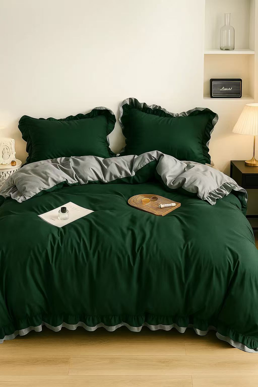 - Podkreśl elegancję swojej sypialni pościelą z urokliwą dwukolorową falbaną w eleganckim odcieniu butelkowej zieleni i jasnej szarości. Luksusowy komfort i wyjątkowy styl zapewnią Ci niezapomniane noce. Zanurz się w miękkości i klasyce :)