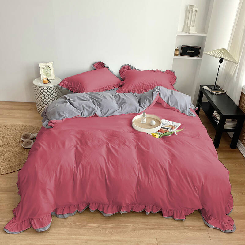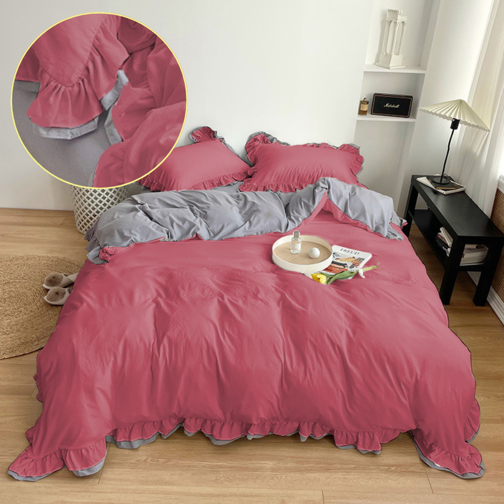 Pościel z podwójną falbanką dwukolorowa czerwono-jasnoszara 200x220 3 el.