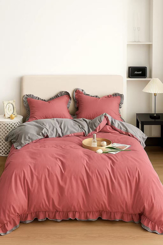- Podkreśl elegancję swojej sypialni pościelą z urokliwą dwukolorową falbaną w eleganckim odcieniu czerwieni i jasnej szarości. Luksusowy komfort i wyjątkowy styl zapewnią Ci niezapomniane noce. Zanurz się w miękkości i klasyce :)