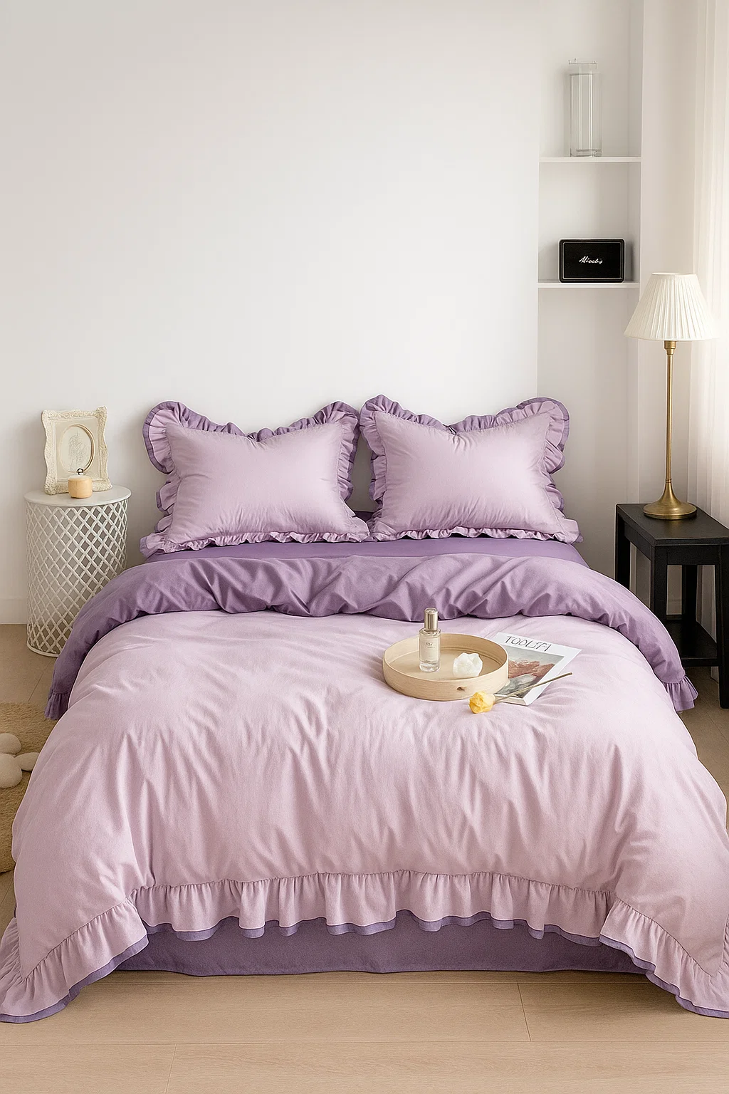 - Podkreśl elegancję swojej sypialni pościelą z urokliwą dwukolorową falbaną w eleganckim odcieniu różu i fioletu. Luksusowy komfort i wyjątkowy styl zapewnią Ci niezapomniane noce. Zanurz się w miękkości i klasyce :)