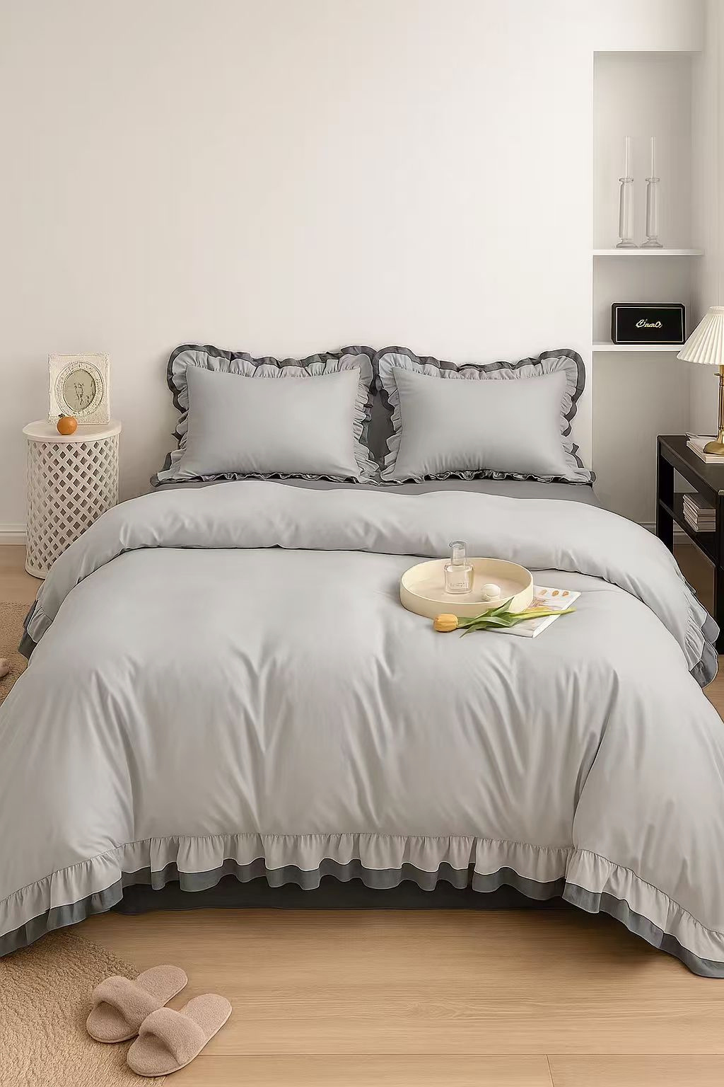- Podkreśl elegancję swojej sypialni pościelą z urokliwą dwukolorową falbaną w eleganckim odcieniu ciemnej i jasnej szarości. Luksusowy komfort i wyjątkowy styl zapewnią Ci niezapomniane noce. Zanurz się w miękkości i klasyce :)