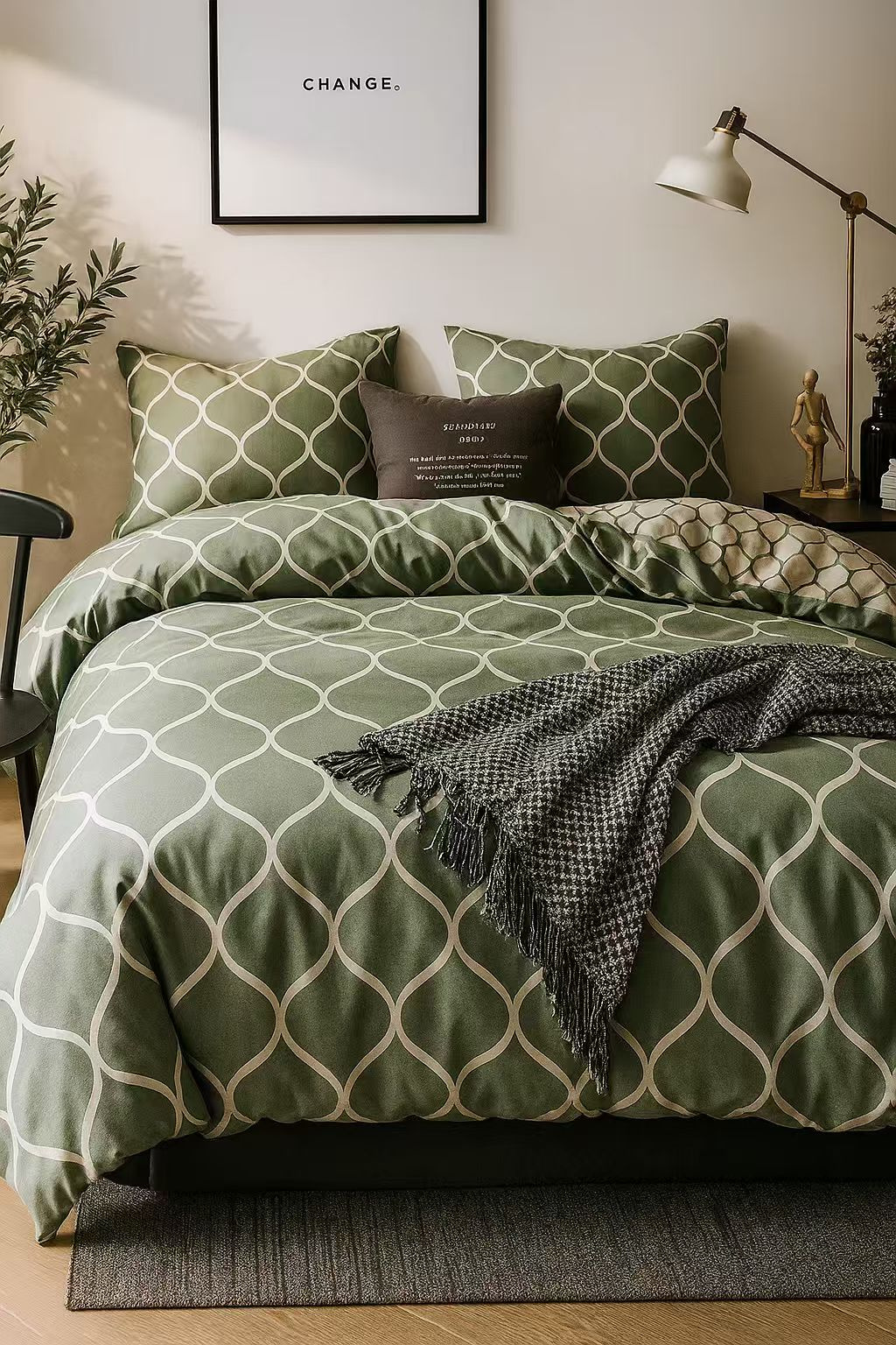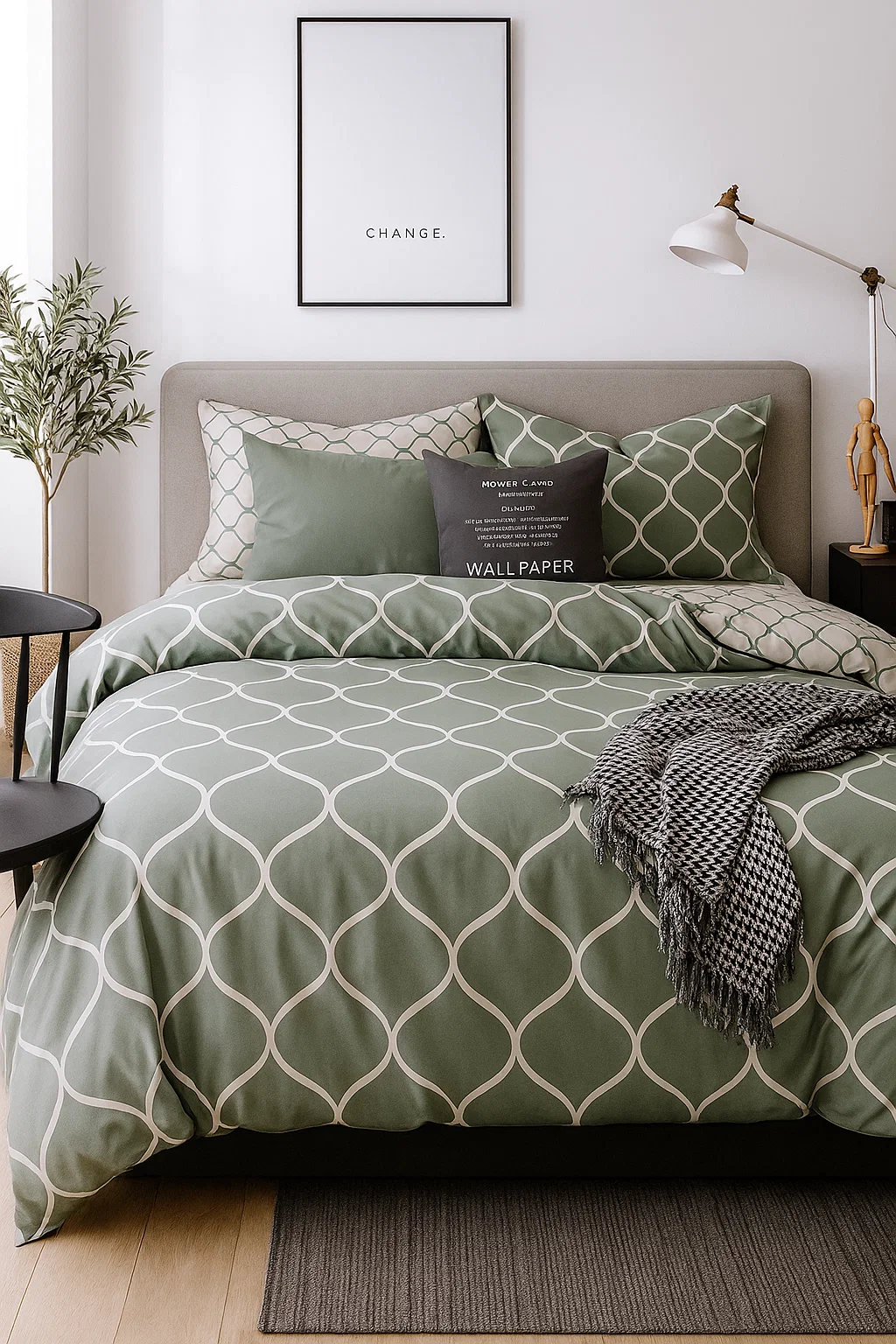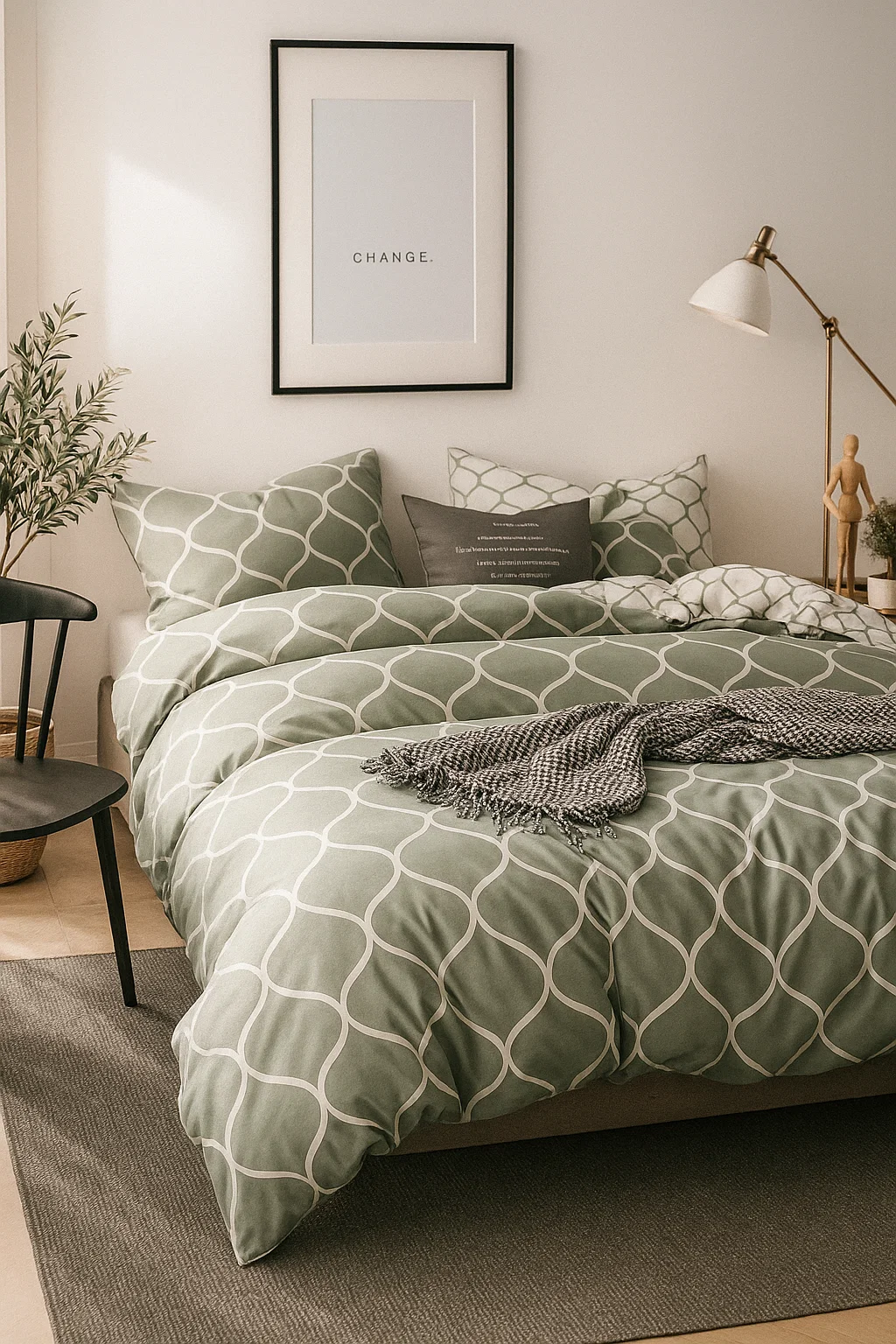 • Pościel w geometryczny elegancki wzór, zielonoszara, kremowa