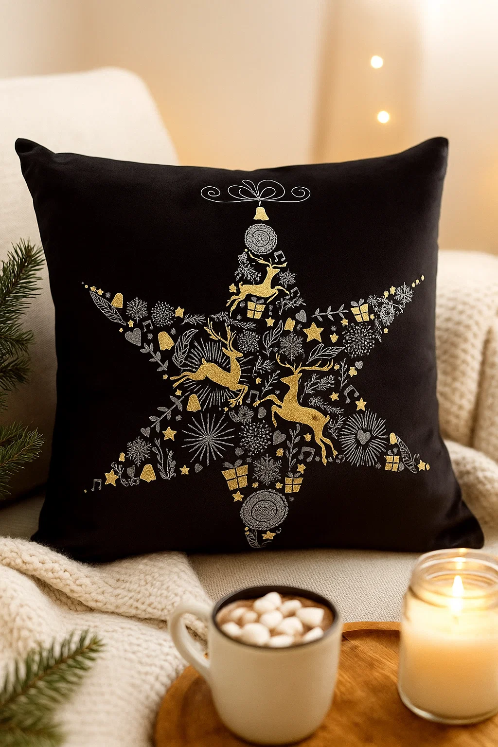 • Dekoracyjna welurowa poszewka świąteczna na jasiek. Czarna powłoczka na święta w złote renifery, gwiazdki. Welur z trwałym nadrukiem.
