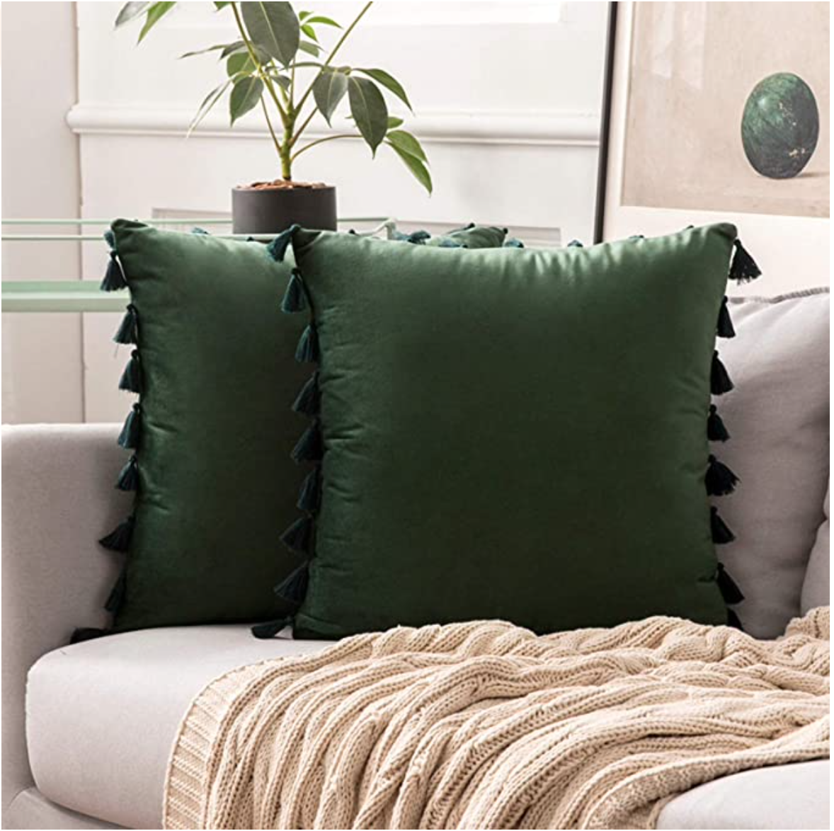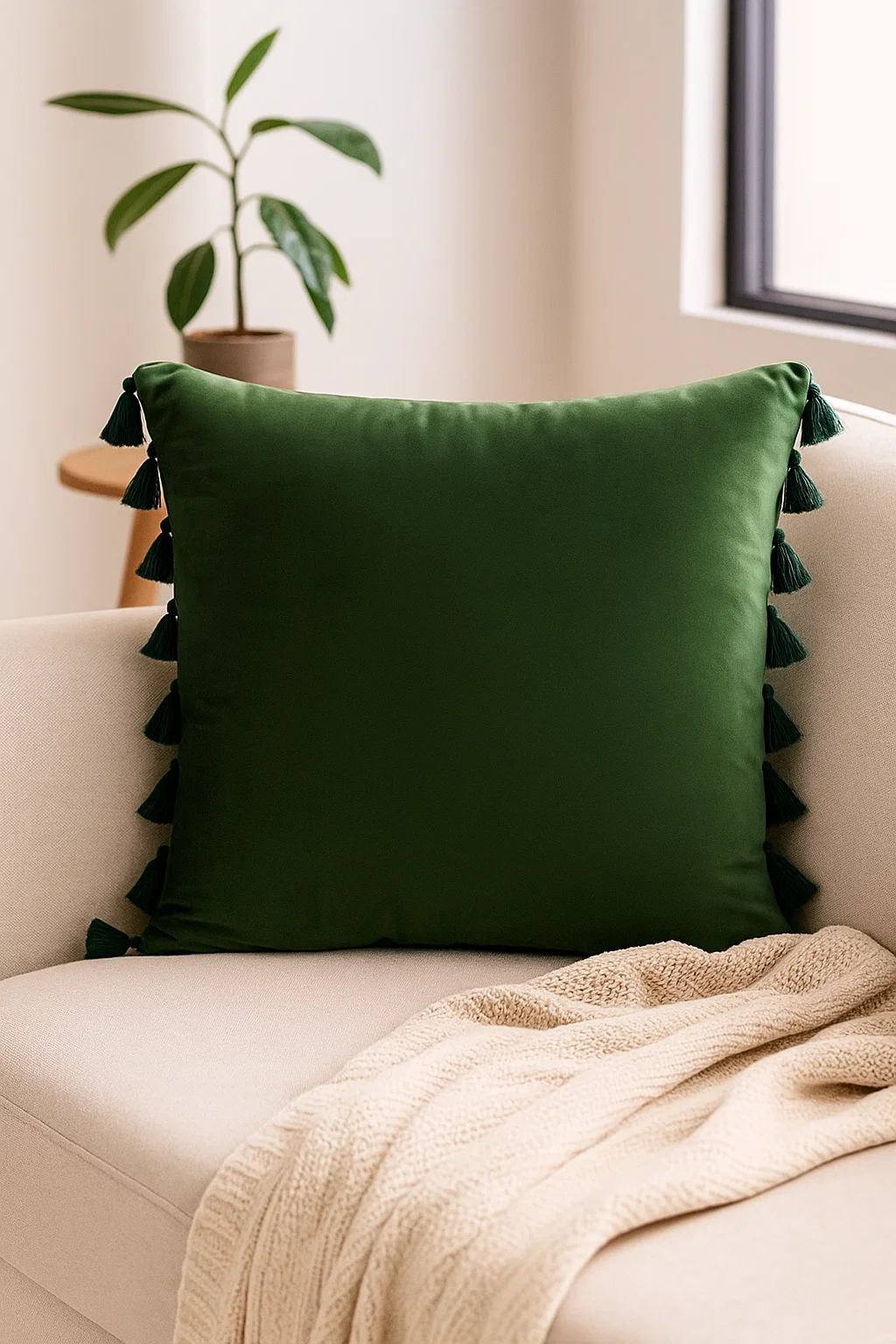 Opinie o Poszewka na poduszkę dekoracyjna 40x40 butelkowa zielona frędzle