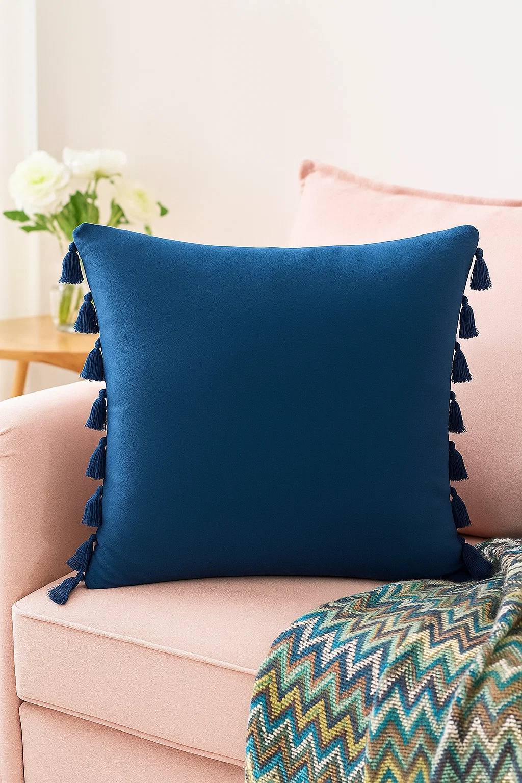 Opinie o Poszewka na poduszkę dekoracyjna 40x40 frędzle granatowa