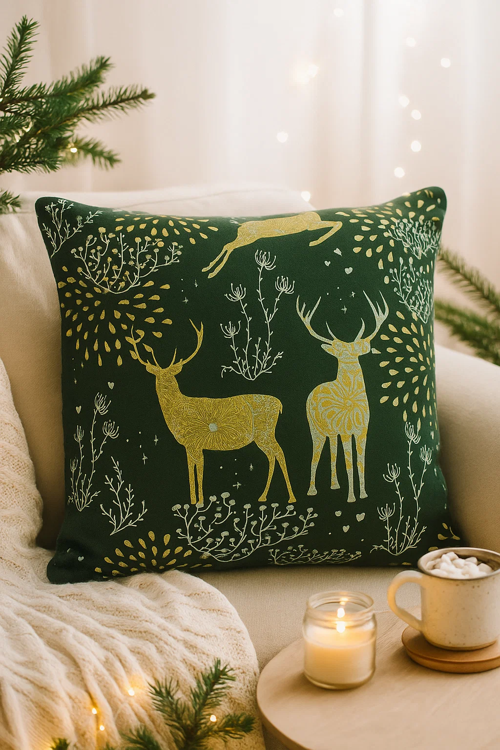 Opinie o Poszewka na poduszkę świąteczna butelkowa zielona w złote renifery 40x40