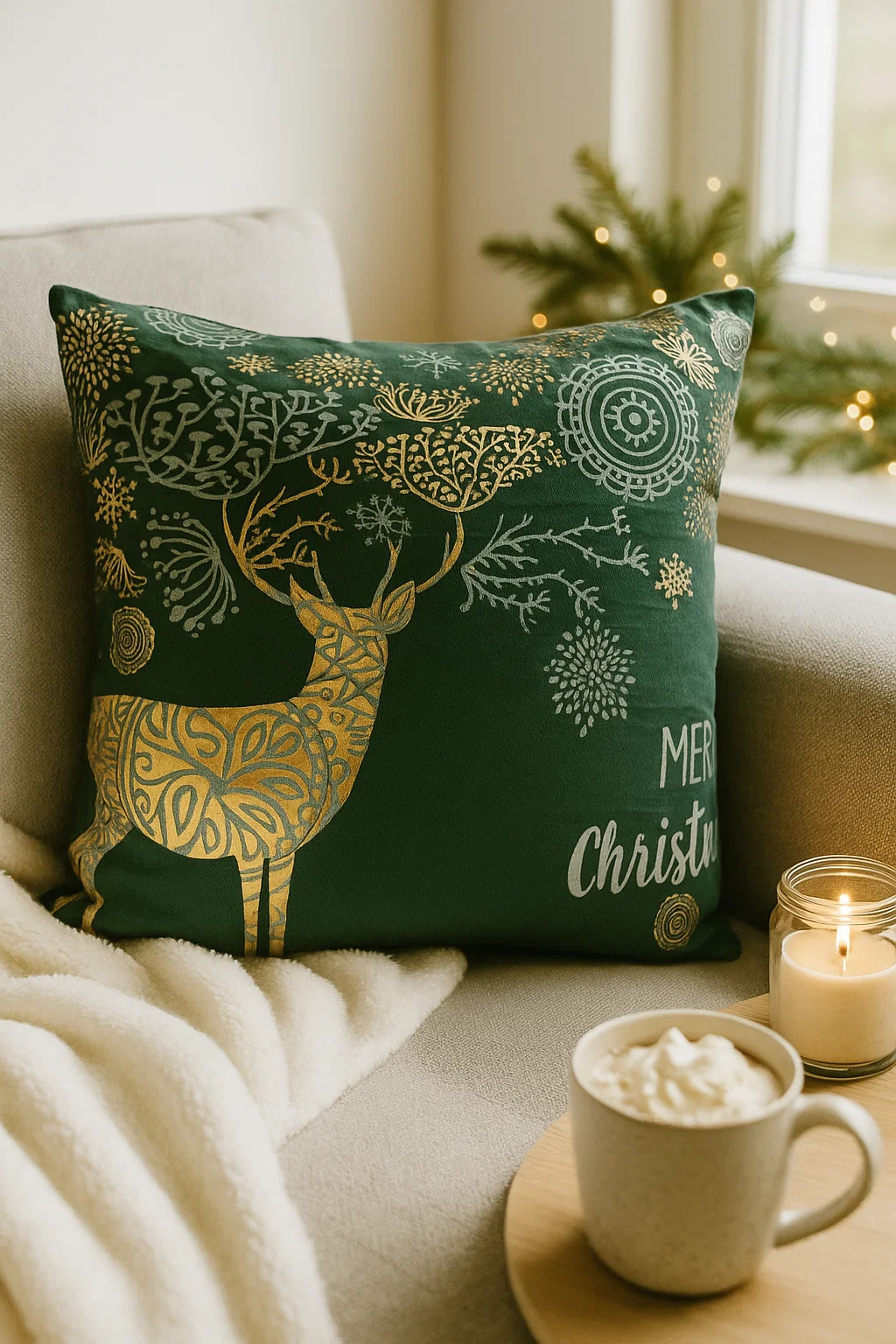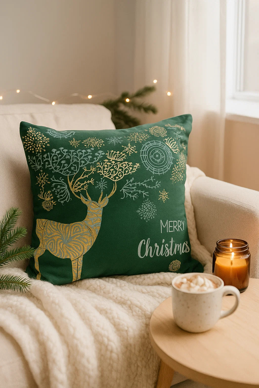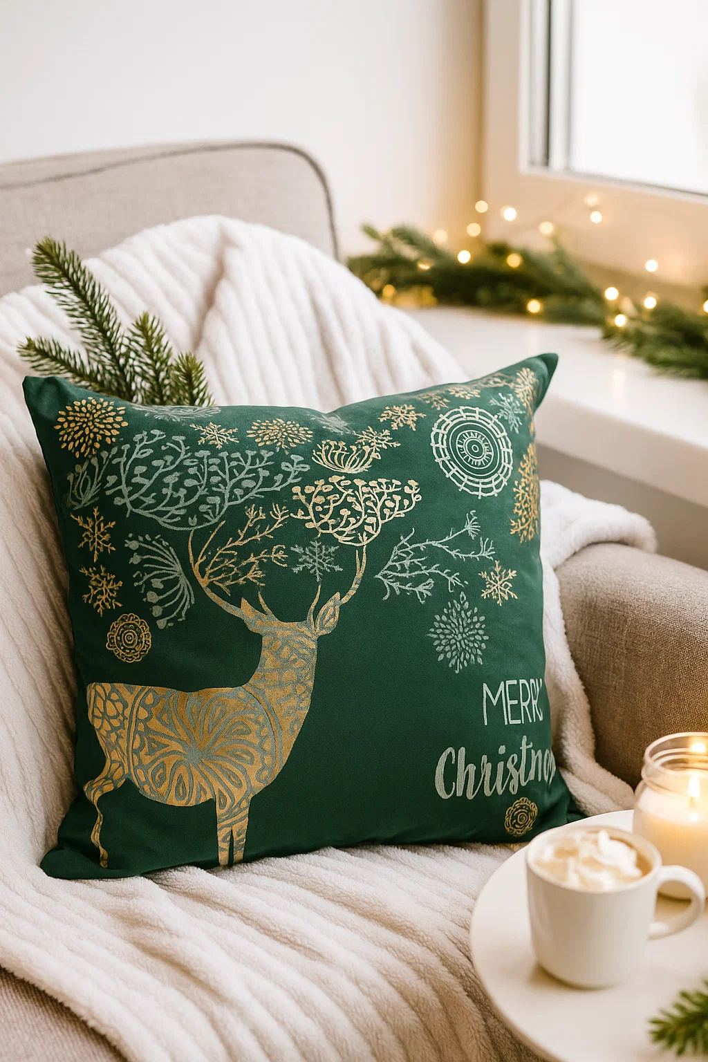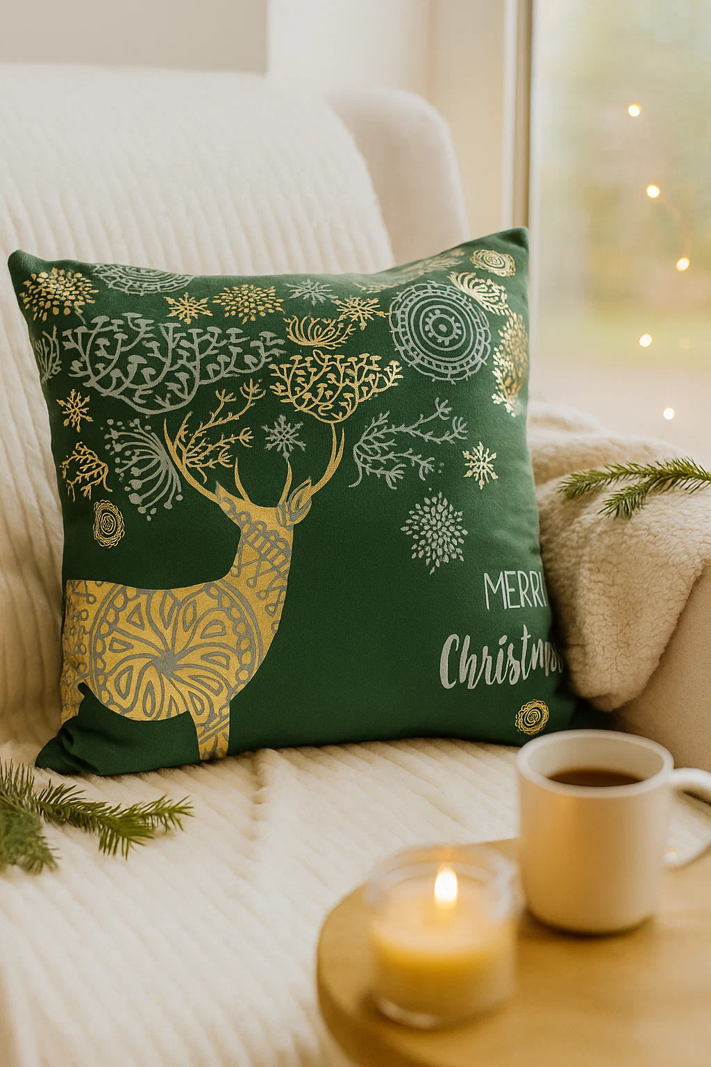 - Dekoracyjna welurowa poszewka świąteczna na jasiek. Ciemna zielona powłoczka na święta ze złotym reniferem. Welur z trwałym nadrukiem.
