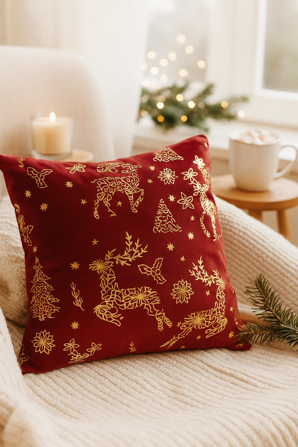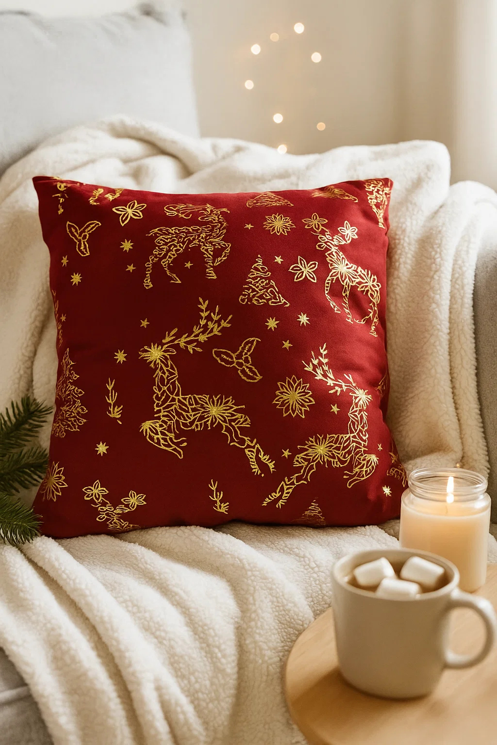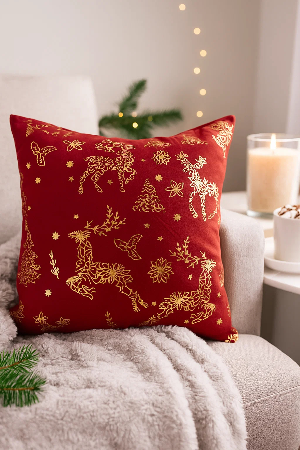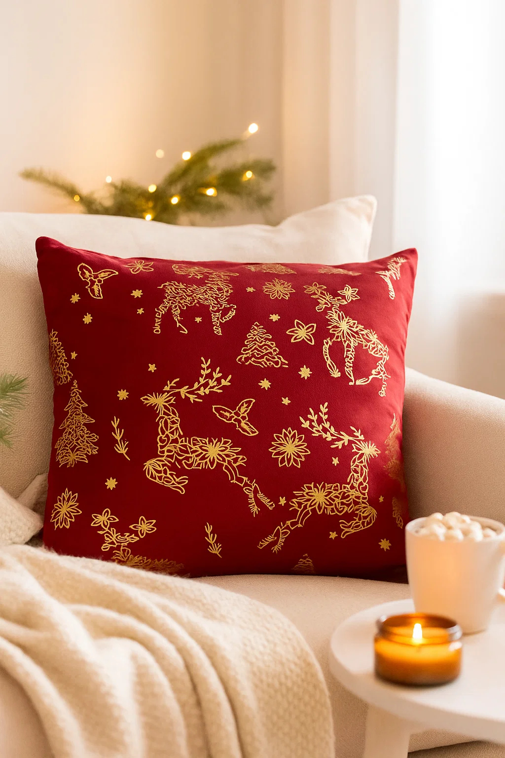 - Dekoracyjna welurowa poszewka świąteczna na jasiek. Czerwona powłoczka na święta w złote renifery. Welur z trwałym nadrukiem.