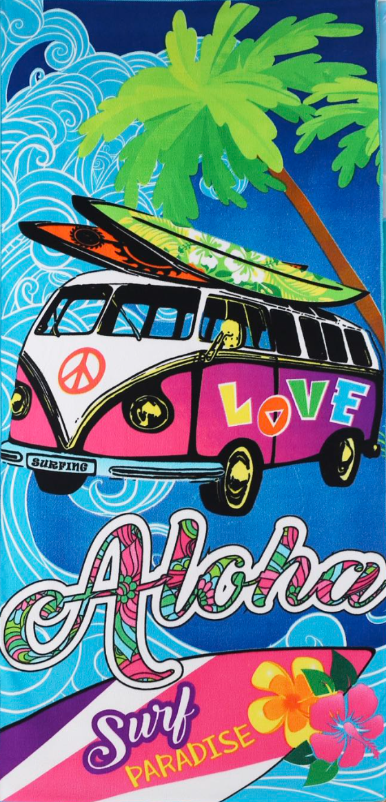 • Ręcznik plażowy, z mikrofibry z napisami aloha, love, surf paradise. Przedstawia hipisowski samochód i plażę. Ręcznik w rozmiarze 90x170, super chłonny, szybkoschnący.