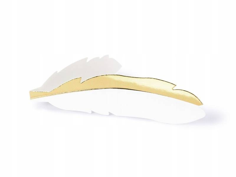 • Winietki, wizytówki w kształcie piórka, białe ze złotym akcentem