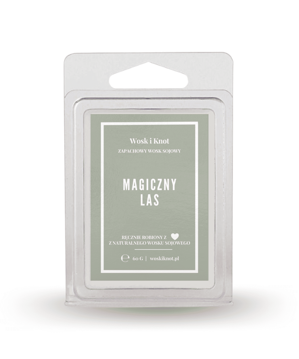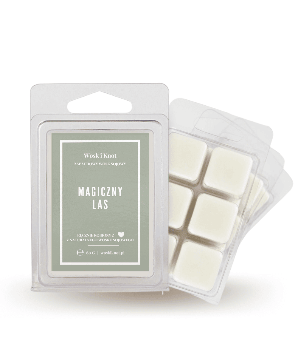 Wosk Zapachowy Magiczny Las – prawdziwie leśny zapach, intensywne i dominujące nuty wysuszonego drewna dębowego i cedrowego, sosna, a także fiołek z goździkiem. Wyrazistości dodaje nuta figi. Tłem na całej kompozycji jest bursztyn i piżmo.